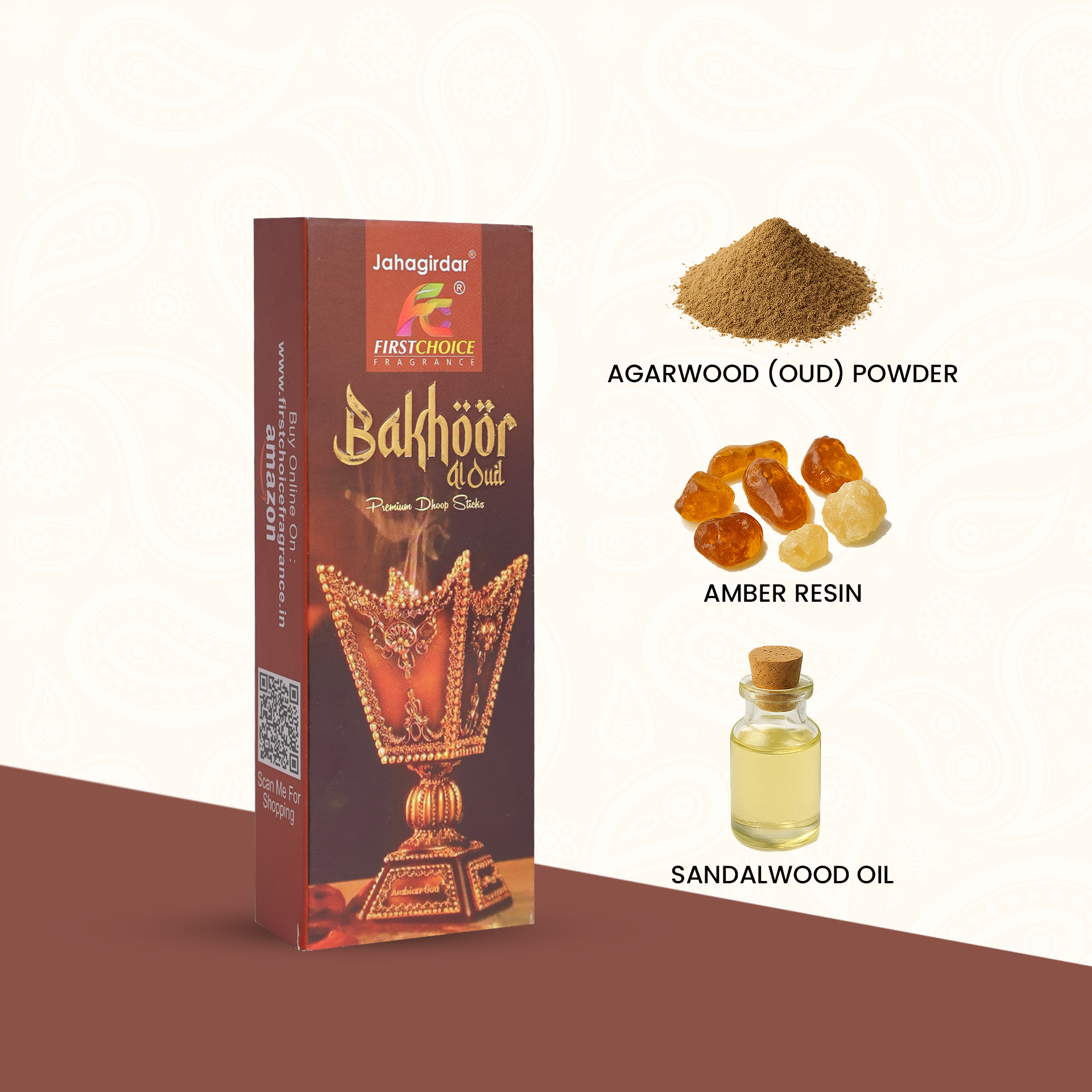 Bakhoor Al Oud Dhoop Sticks are crafted with luxurious agarwood (oud) powder blended with amber resin, musk ketone, and rich rose absolute, giving the fragrance its deep, royal warmth. The addition of frankincense and myrrh adds classic resinous richness, while sandalwood oil and a hint of saffron or cardamom create a smooth, exotic sweetness. Made in a charcoal-free base, these dhoop sticks deliver a slow, clean, and intensely aromatic burn.